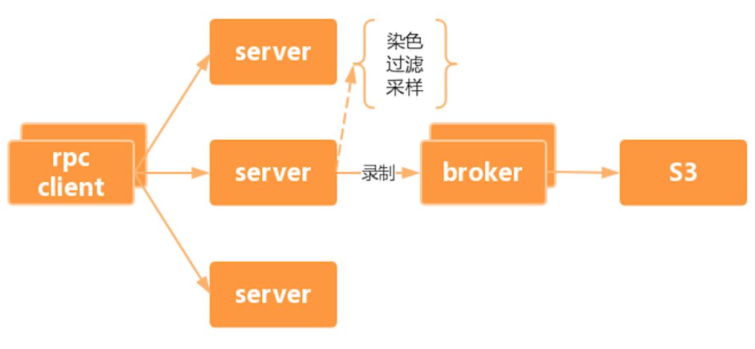 对于 RPC 服务,服务调用量远超 HTTP 的量级,所以在线上环境不太可能去记录相应的日志。这里我们使用对线上服务进行实时流量录制,结合 RPC 框架提供的录制功能,对集群中的某几台机器开启录制,根据要录制的接口和方法名,将请求数据上报到录制流量的缓冲服务(Broker)中,再由 Broker 生成最终的压测词表,上传到存储平台(S3)。