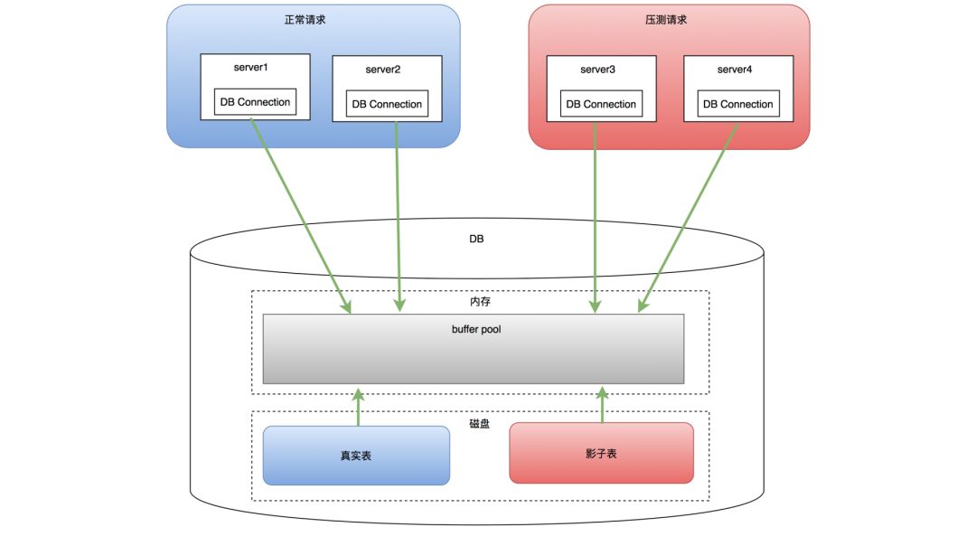 还有一个比较棘手的问题是针对写请求的压测,因为它会向真实的数据库中写入大量的脏数据。我们借鉴了阿里最早提出的“影子表”隔离的方案。“影子表”的核心思想是,使用线上同一个数据库,包括共享数据库中的内存资源,因为这样才能更接近真实场景,只是在写入数据时会写在了另一张“影子表”中。