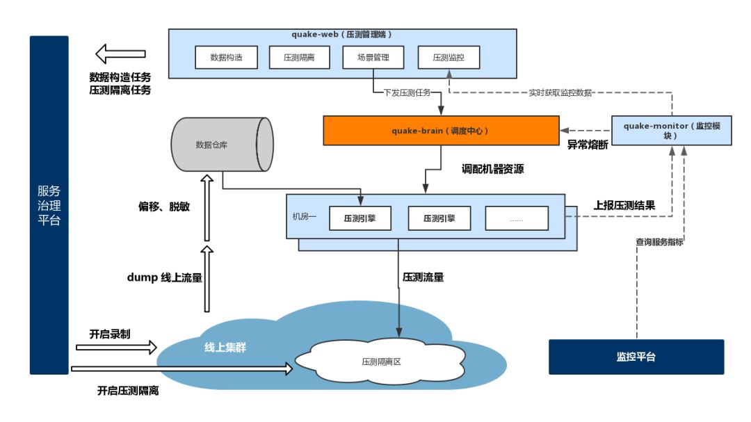 Quake 集数据构造、压测隔离、场景管理、动态调控、过程监控、压测报告为一体,压测流量尽量模拟真实,具备分布式压测能力的全链路压测系统,通过模拟海量用户真实的业务操作场景,提前对业务进行高压力测试,全方位探测业务应用的性能瓶颈,确保平稳地应对业务峰值。
