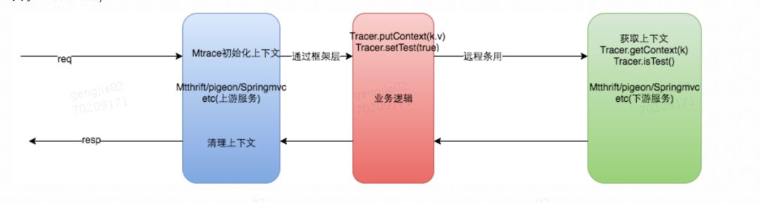 对于跨服务的调用,架构团队对所有涉及到的中间件进行了一一改造。利用 Mtrace (公司内部统一的分布式会话跟踪系统)的服务间传递上下文特性,在原有传输上下文的基础上,添加了测试标识的属性,以保证传输中始终带着测试标识。下图是 Mtrace 上下游调用的关系图: