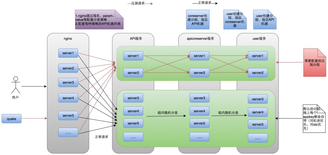 一些大型的压测通常选择在深夜低峰时期进行,建议相关的人员要时刻关注各自负责的系统指标,以免影响线上的正常使用。而对于一些日常化的压测,Quake 提供了更加安全便捷的方式进行。在低峰期,机器基本都是处于比较空闲的状态。我们将根据业务的需求在线上对整条链路快速创建一个压测分组,隔出一批空闲的机器用于压测。将正常流量与测试流量在机器级别进行隔离,从而降低压测对服务集群带来的影响。