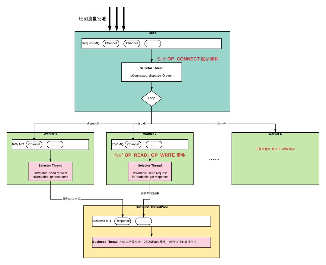 这里主要耗时都在 IO 的读写事件上,为了达到单位时间内尽可能多的发起压测请求,我们将连接事件与读写事件分离。连接事件采用单线程 Selector 的方式来处理,读写事件分别由多个 Worker 线程处理,每个 Worker 线程也是以 NIO 方式进行处理,由各自的 Selector 处理 IO 事件的读写操作。这里每个 Worker 线程都有自己的事件队列,数据彼此隔离,这样做主要是为了避免数据同步带来的性能开销。