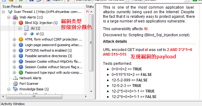扫描的结果能看到发现漏洞所用的payload,对应的HTTP头信息、HTML、可发送到HTTP Editor中等……