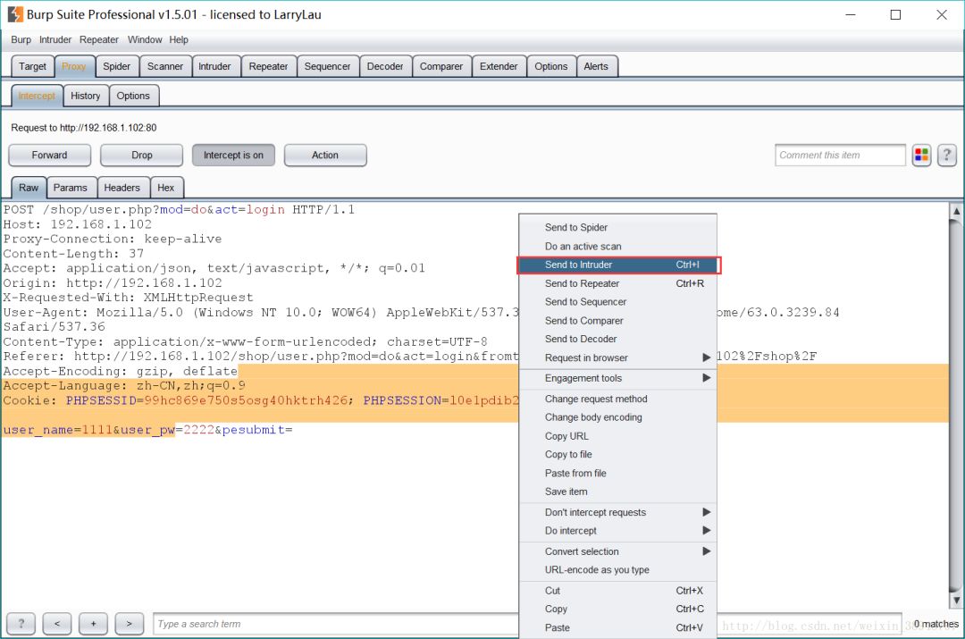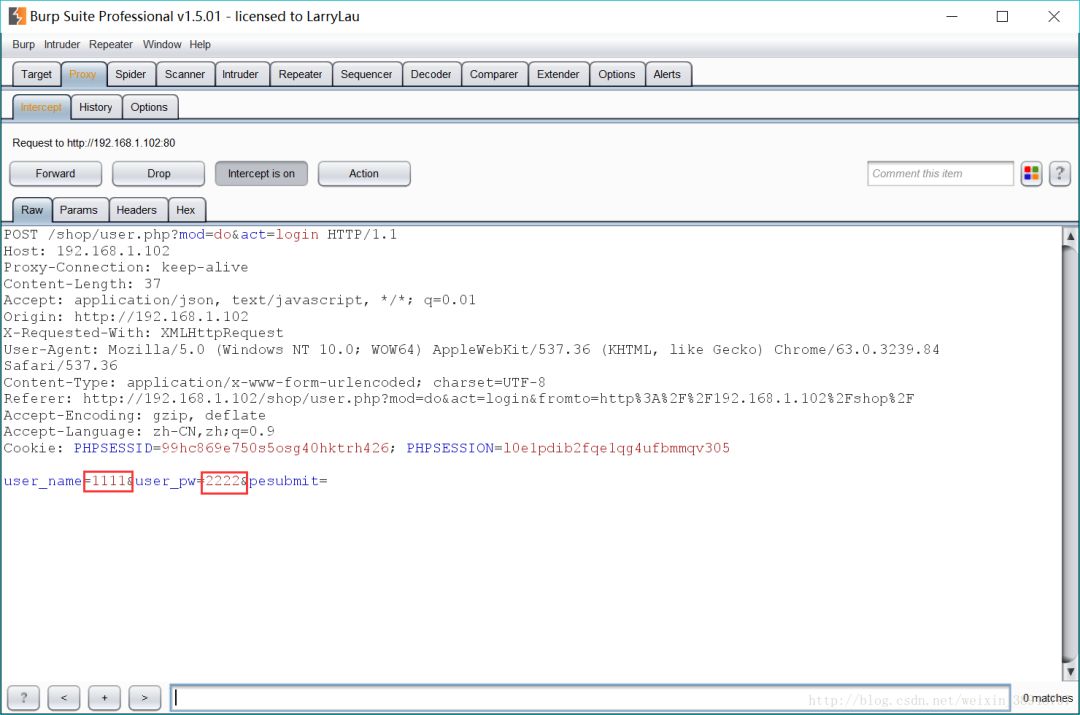 这时候登陆的请求就被Burpsuite抓取到了,回到Burpsuite主界面:可以看到输入的测试用户名密码赋值给了user_name参数和user_pw参数,找到用户名密码的参数就好办了。