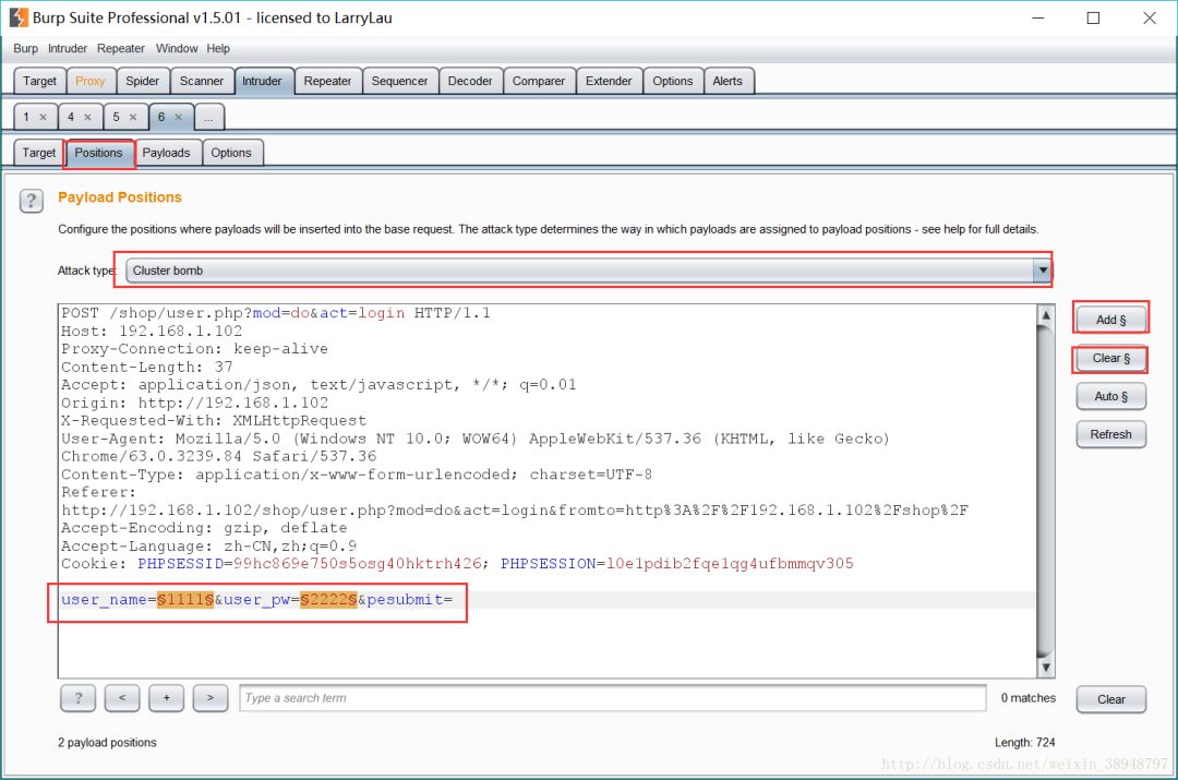 在Intruder-Position中设置,将自动设置的position【Clear】掉,然后在请求中user_name和user_pw的地方点击【Add】添加position,设置攻击类型为【Cluster bomb】
