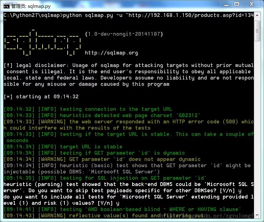 C:\Python27\sqlmap>python sqlmap.py -u "http://192.168.1.150/products.asp?id=134"