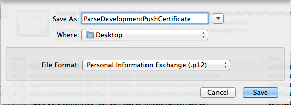 - 选择Export后会出现一个页面,以便我将证书以.p12格式导出,.p12是服务器端所需的文件,至少是Parse所需的。*注意*,一定确保上一步中我们选中了"My Certificates"分类,否则在这一步中.p12格式是disable的。终于得到了服务器端所要的“Apple签证”,按照服务器端的配置要求去配置吧,在Parse中只需将这个.p12文件上传就可以了。