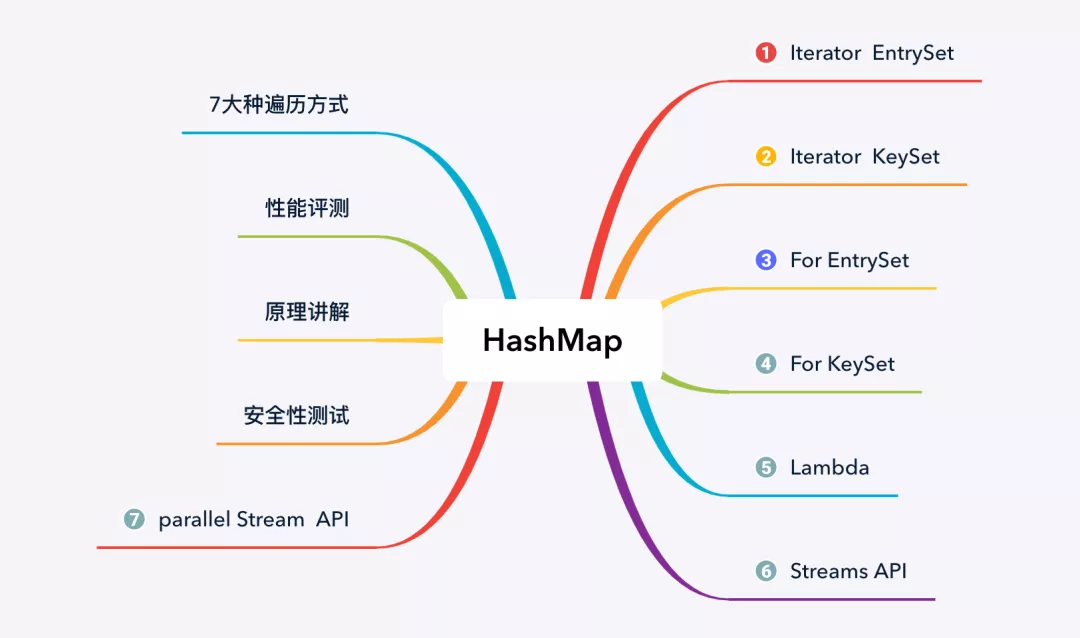 本文先从 HashMap 的遍历方法讲起,然后再从性能、原理以及安全性等方面,来分析 HashMap 各种遍历方式的优势与不足,本文主要内容如下图所示: