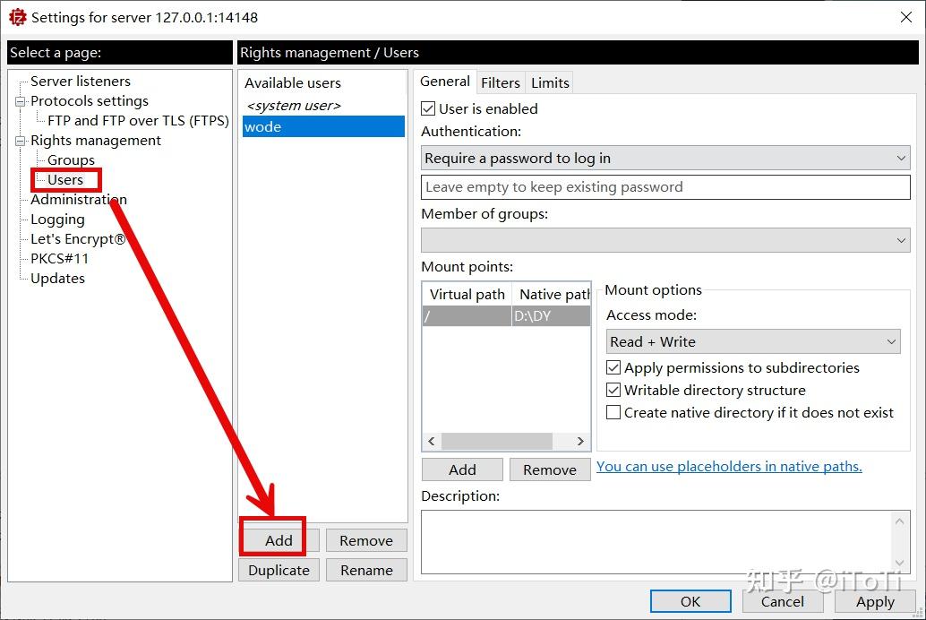 4.在配置界面,点击“User” -> “Add”,添加用户并设置密码。