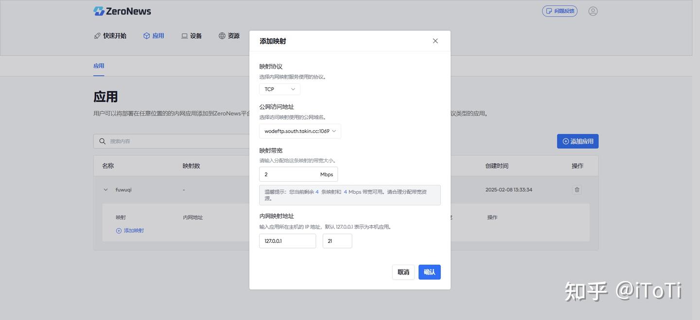 4、创建成功之后,需要创建映射。选择tcp协议,以及刚创建好的映射,内网地址为127.0.0.1,端口默认为 21,点击确认后创建可公网访问的映射地址