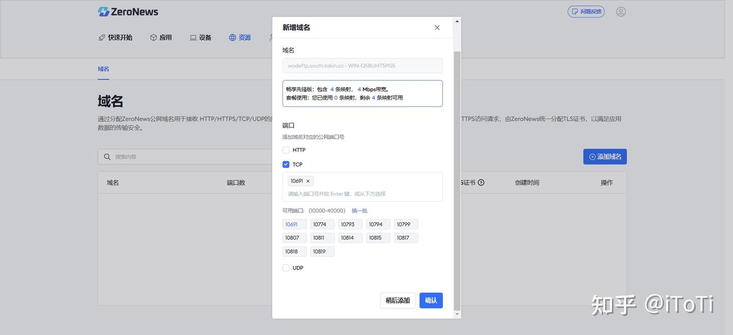 3、然后在用户后台创建一个自定义的域名,并勾选tcp协议,以及选择其中任意一个端口