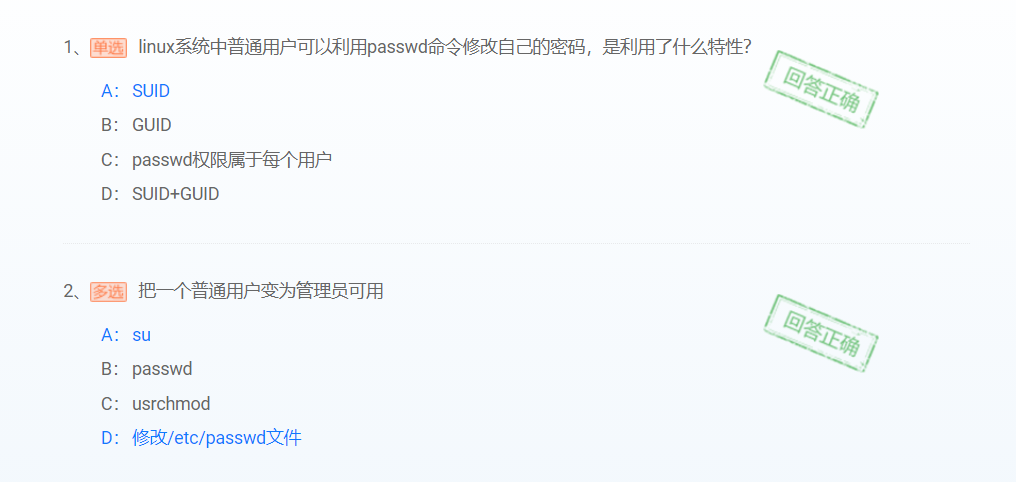 (2)/etc/passwd文件对任何用户均可读,为了增加系统安全性,用户的口令通常用shadow passwords保护。/etc/shadow只对root用户可读。在安装系统时,会询问用户是否启用shadow passwords功能。在安装好系统后也可以用pwconv命令和pwunconv来启动或取消shadow passwords保护。经过shadow passwords保护的帐户口令和相关设置信息保存在/etc/shadow文件里。
