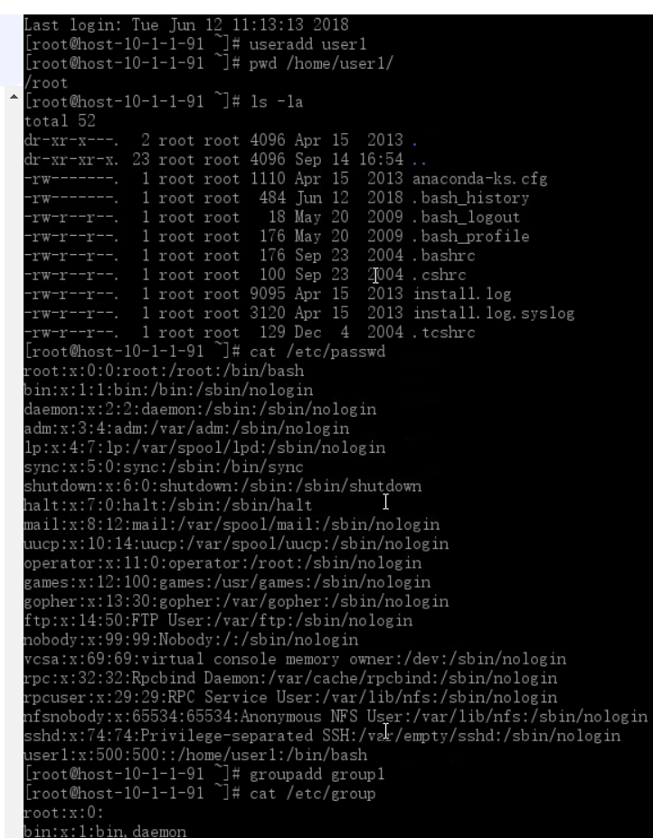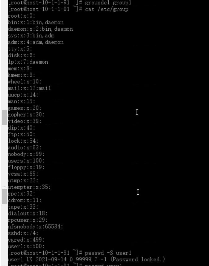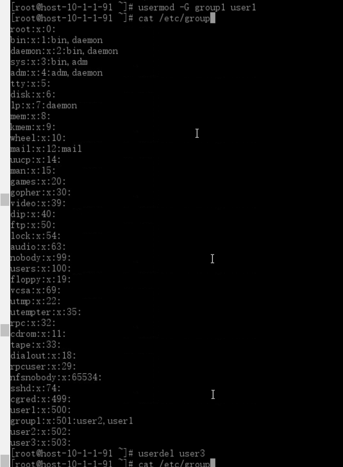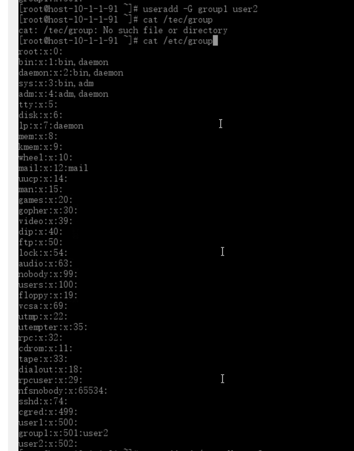 至此,group1组中有user1,user2两个用户,用命令查看/etc/group文件如下图: