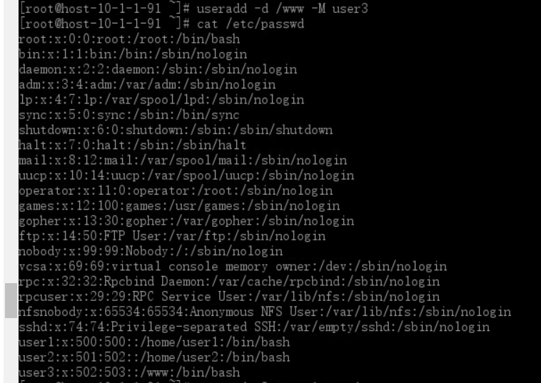 4)创建一个新用户user3,指定登录目录为/www,不创建自家用户目录(-M)