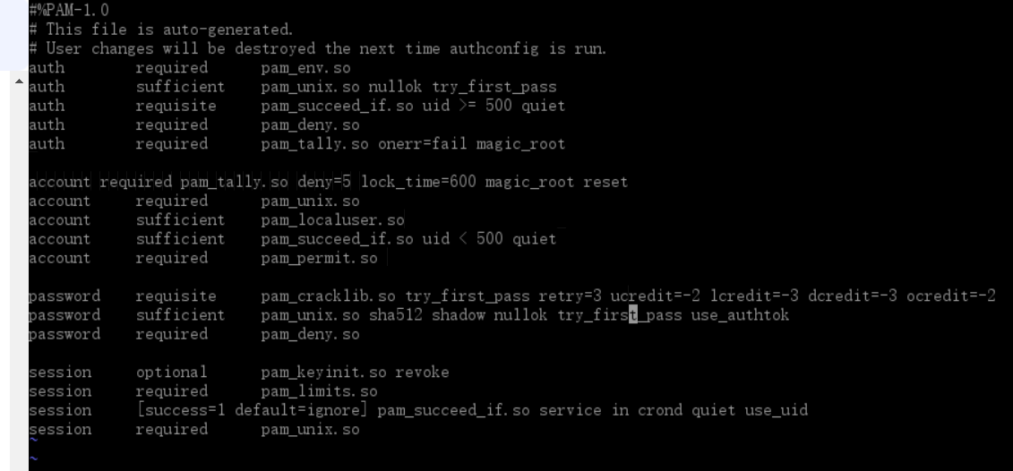 修改/etc/pam.d/system-auth配置:(注意:在root用户下进行,其余用户对这个文件只有读的权限)