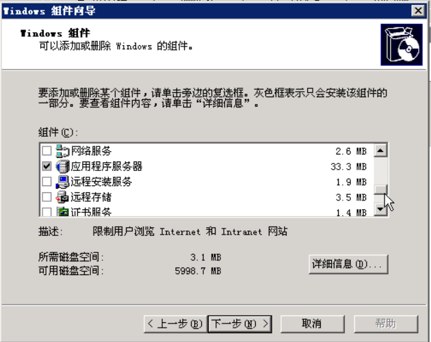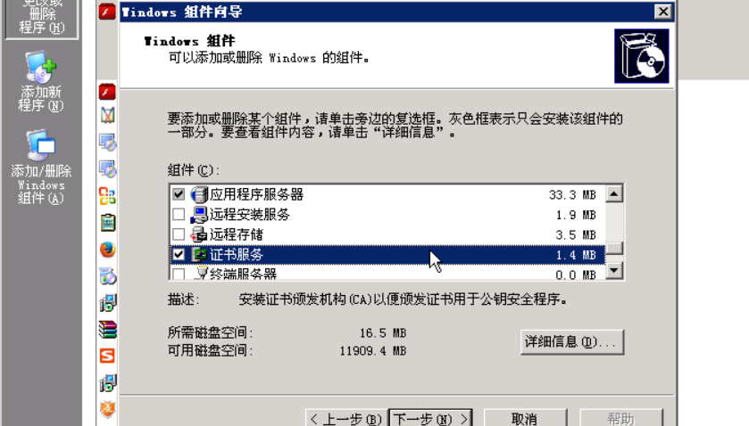 依次点击:“添加删除windows组件”,在组件向导中选中“应用程序服务器”与“证书服务”,先不要点击下一步: