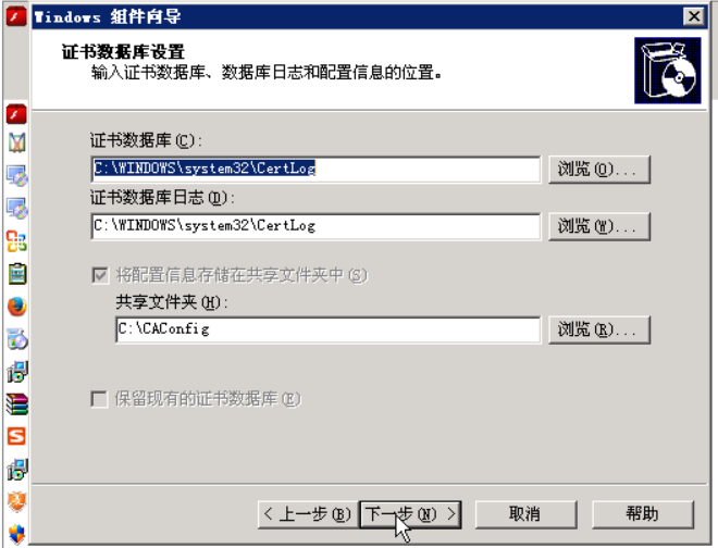 下一步后,会出现证书数据库的相关设置,不用修改,继续下一步: