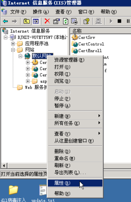 安装完成后,打开IIS,右键“默认网站”,选择“属性”: