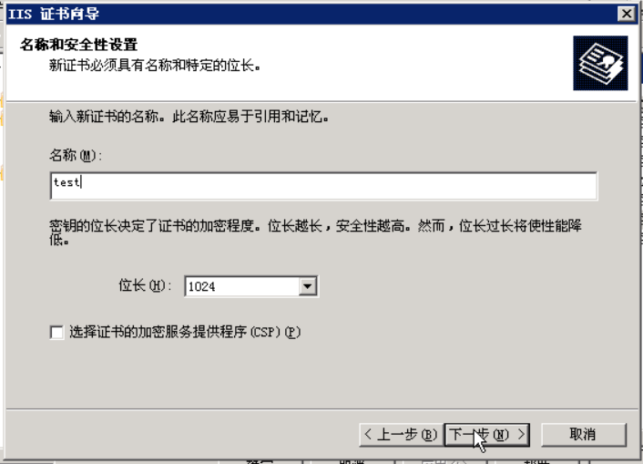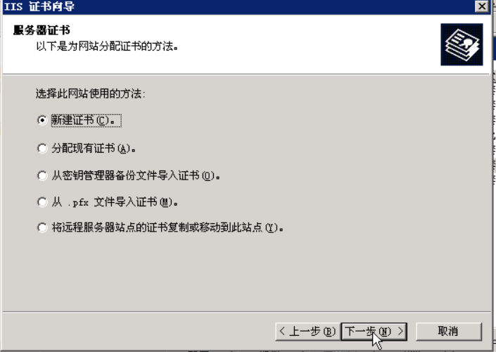出现如下对话框,保持默认选项“新建证书”不动,继续下一步: