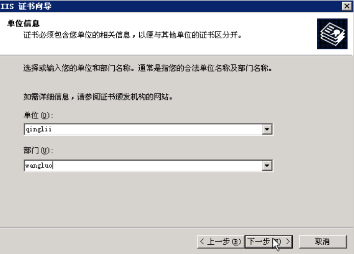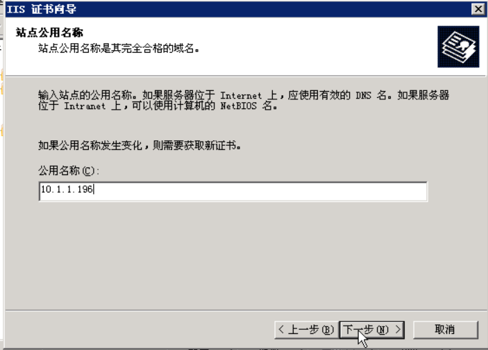 填写公用名称,由于在本环境中没有使用DNS服务器,没有域名因此使用IP地址访问,在公用名称中输入本机的IP地址,如果名称错误,后面过程中会出现问题,因此应仔细核对: