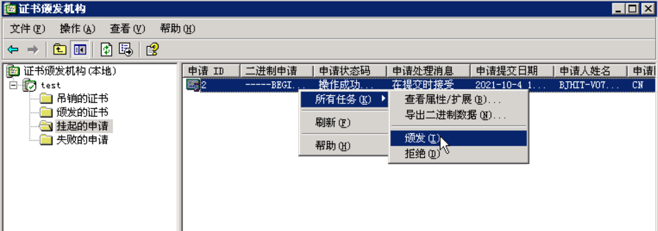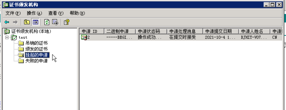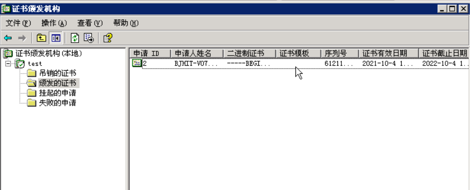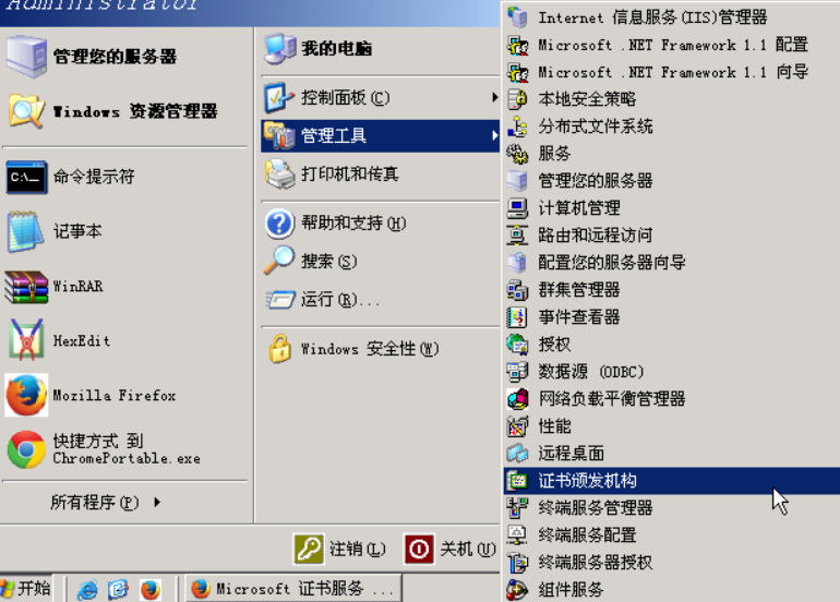 证书的颁发在证书服务器中操作,接下来的操作是证书审核员的角色,切换到CA服务器,点击“开始”>>“管理工具”>>“证书颁发机构”: