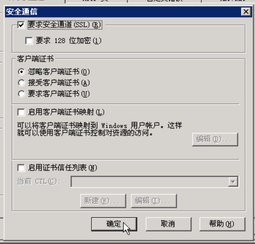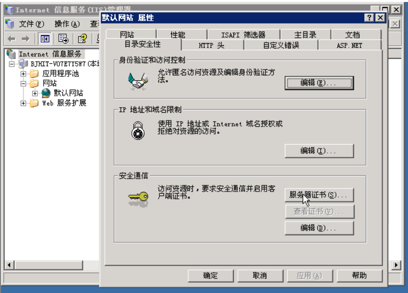 在“默认网站属性”中选择“目录安全性”标签,点击“服务器证书”: