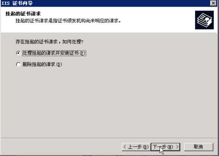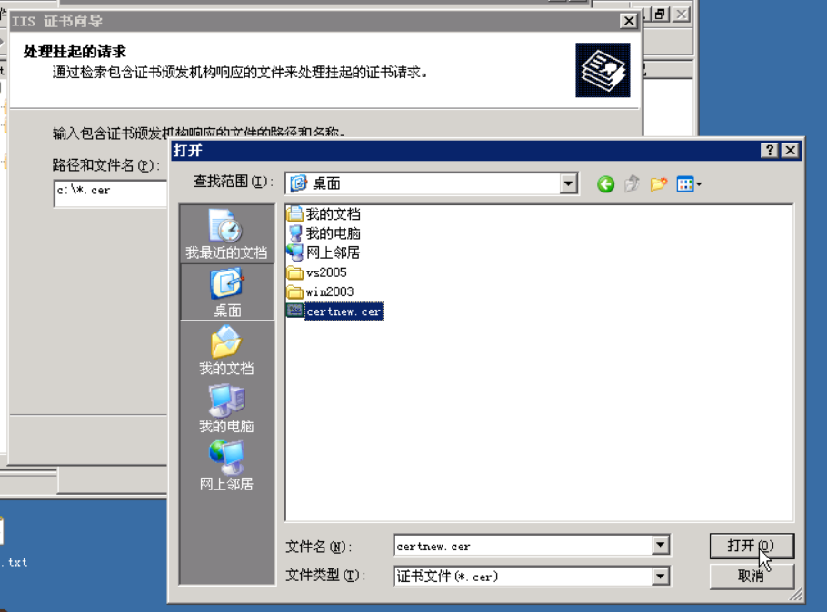 在“处理挂起请求”中选择“浏览”,选择刚才下载的证书文件,并打开,下一步,使用默认的443端口,点击下一步: