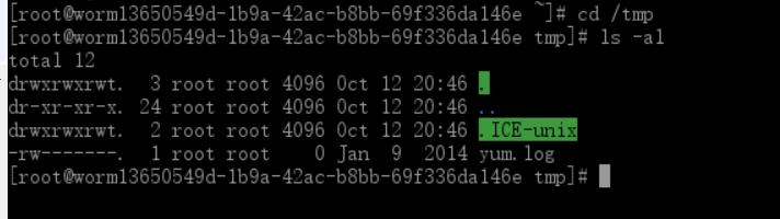 2.经过一段时间之后(大约10分钟),登录Worm2。同样使用命令:”ls -al /tmp”查看,可以发现主机也被此蠕虫感染。对比效果如下图: