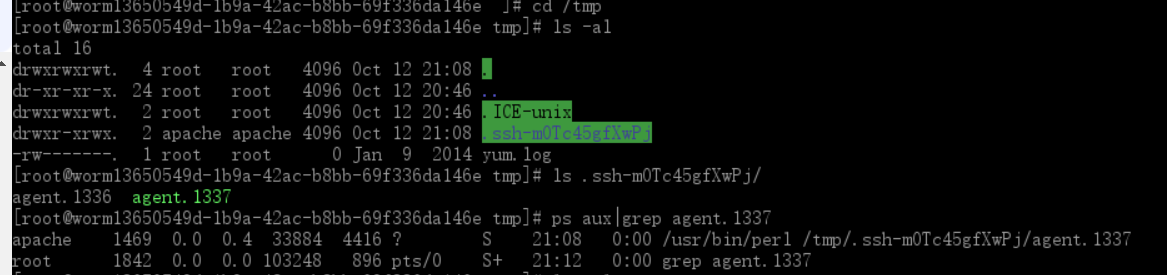 apache 1827 0.0 0.8 33884 4420 ? S Jun24 0:00 /usr/bin/perl /tmp/.ssh-mOTc45gfXwPj/agent.1337