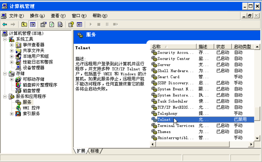 (3)右键“我的电脑”->管理->服务和应用程序->服务,找到Telnet服务,关闭之: