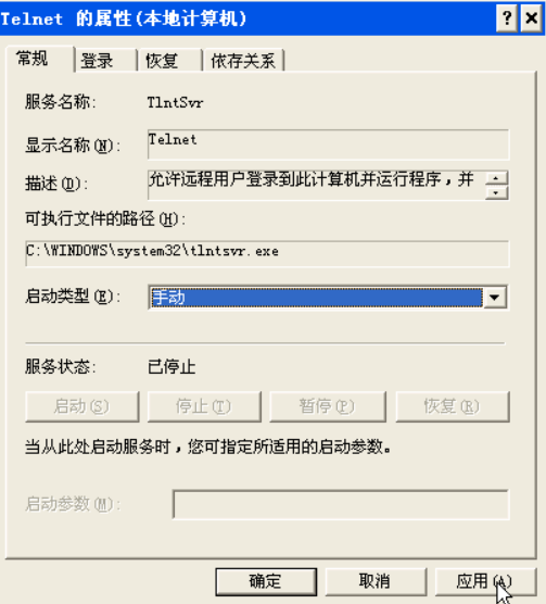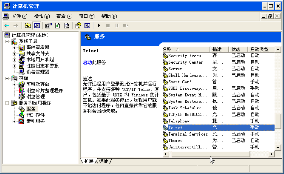 进入主机A,右键“我的电脑”->管理->服务和应用程序->服务,找到Telnet服务,如图所示: