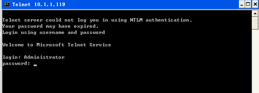 telnet连接建立之后,可输入用户名密码等相关信息进行登录,telnet服务登录到远程主机: