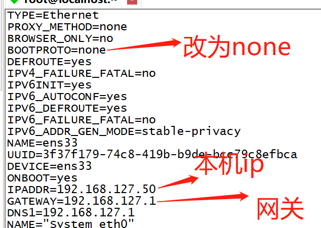 - 首先需要配置外网,为后续yum安装软件做好准备,设置好虚拟机的网关后,编辑配置网络文件 vi /etc/sysconfig/network-scripts/ifcfg-ens33