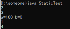 然后会执行StaticTest()方法,执行前先执行构造代码块再初始化成员变量,所以先输出2,a=100,b由于已经初始化完毕,不执行