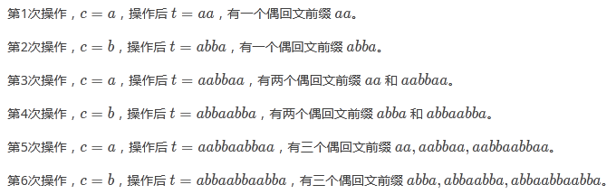 第6次操作,\(c=b\),操作后 \(t=abbaabbaabba\),有三个偶回文前缀 \(abba,abbaabba,abbaabbaabba\)。