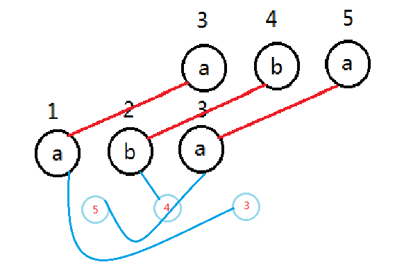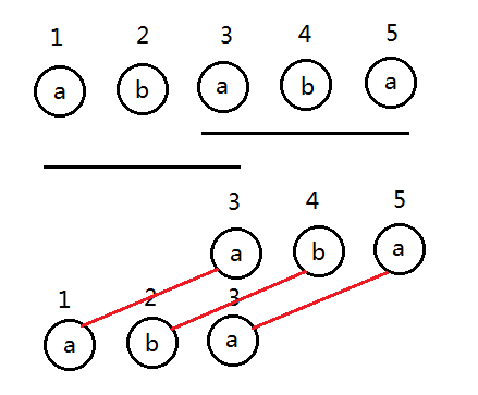 我们以第5次操作为例。字符串\(ababa\)跑\(KMP\),得到\(next[5]=3\).(即与\(aba\)匹配)而第3次操作的结果,正是第5次所得字符串子串的最大偶回文前缀(因为\(KMP\)求的是最大匹配,所以得到的也是最大偶回文前缀),即\(aabbaa\),第5次答案累加之。那更小的偶回文前缀,如\(aa\)怎么办?放心,因为\(aabbaa\)子串的最大偶回文前缀即是\(aa\),所以在处理第3次操作时就已经累加上了\(aa\),自然这个结果也被累加到了第5次操作的结果中,则: