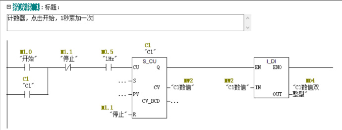 4. 在FC1000的程序段1做计数器,每秒叠加1,根据这个计数器,就可以判断什么时间控制什么交通灯。由于后面的程序要计算余数,所以需要转换为双整型。