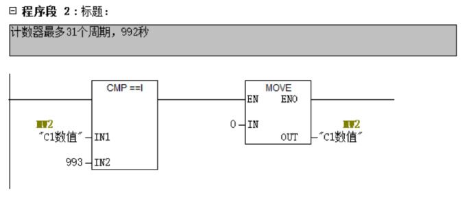 5. 由于计数器最大值999,这个练习中所有灯动作一周期耗时32秒,一个计数器做多可以运转31个控制周期,共计992秒,到了003秒时就应该清零。在FC1000的程序段2做轻灵的逻辑