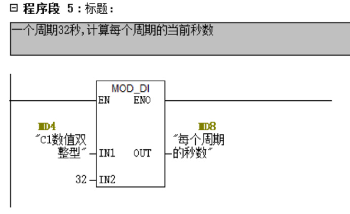 7. 前面说过,一个周期32秒,每个周期之内需要根据当前描述控制相应的信号灯。在FC的程序段5计算当前周期运行到第几秒。