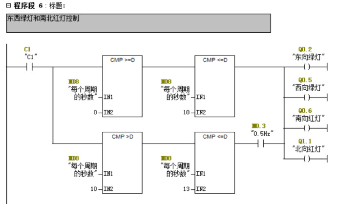 8. 每个周期内0-10秒,东西向绿灯亮,南北向红灯亮。11秒到13秒,东西向绿灯闪烁,南北向红灯闪烁。在FC1000的程序段6做这个控制逻辑。