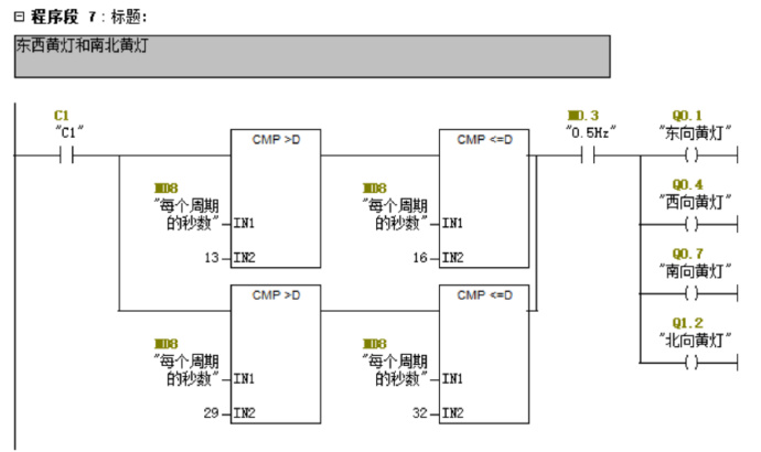9. 在每个周期的14至16秒,也就是东西向绿灯闪烁结束(南北向红灯闪所结束),在每个周期的30至32秒,也就是东西向红灯闪烁结束(南北向绿灯闪烁结束),东西向和南北向黄灯闪烁。在FC1000的程序段7做这个控制逻辑。