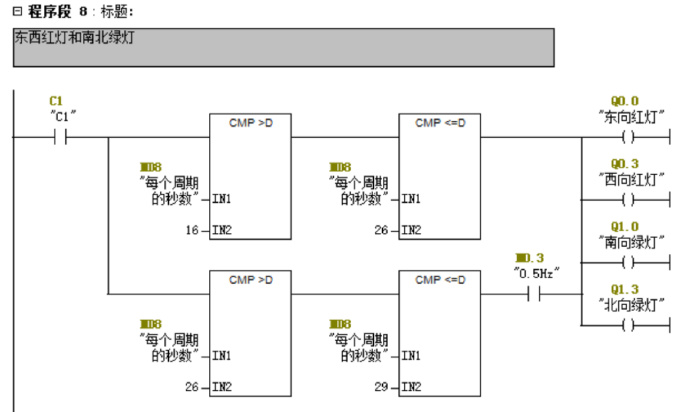 10. 在每个周期的17到26秒,也就是东西向黄灯闪烁结束(南北向黄灯闪烁结束),东西向红灯常亮(南北向绿灯常亮)。在每个周期的27至29秒,也就是东西向红灯常亮结束(南北向绿灯常亮结束),东西向红灯闪烁,南北向绿灯闪烁。在FC1000的程序段8做这个控制逻辑。