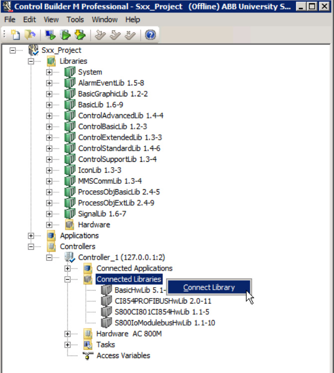 硬件类型在control builder中作为库进行组织和安装。包含硬件类型的库必须连接到控制器,以便将硬件类型(单元)添加到控制器。
