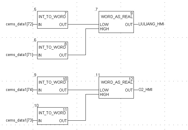 连续的WORD读取上来之后,需要拆分、组合,转换成实际的工程数值,由于数采仪编码4321模式,所以使用下图的方式对WORD进行组合,71是高字节,72低字节,组合成一个REAL数据。74是低字节,75是高字节,组合成一个REAL数据,以此类推。