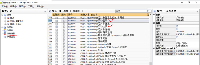 在wincc项目管理器打开报警记录,在系统消息列表中,勾选编号为1008003和1008005两项,这两项表示登录和注销事件触发的报警,默认所有的系统报警都是不启用的,要启用就勾选“已启用”复选框。