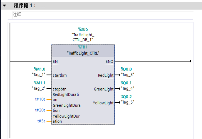 练习一下交通信号灯程序,从简单的功能做起。红绿黄等交替亮起。使用TIA编程,做成FB。