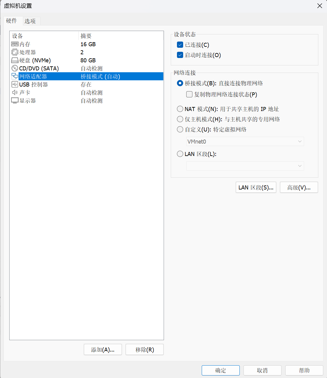 打开虚拟机,点击菜单虚拟机-设置,在对话框选择网络适配器,网络连接选择桥接模式。