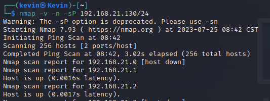 Kali 中输入:nmap -v -n -sP 192.168.21.130/24 可以看到,我们的网关和winxp被扫描出来