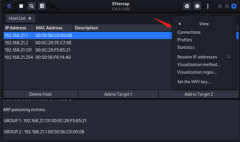 ettercap:一个基于ARP地址欺骗方式的网络嗅探工具,主要适用于交换局域网络。